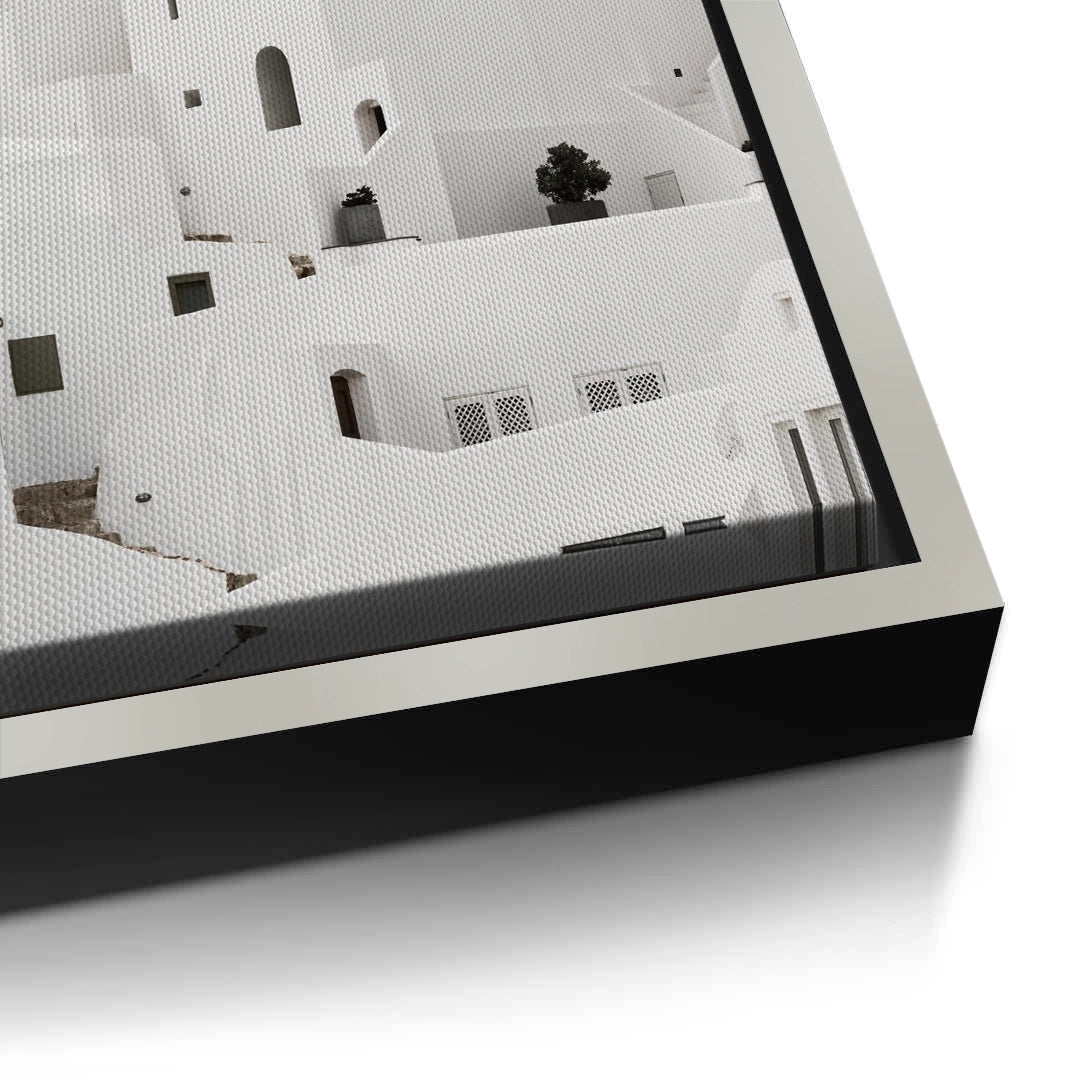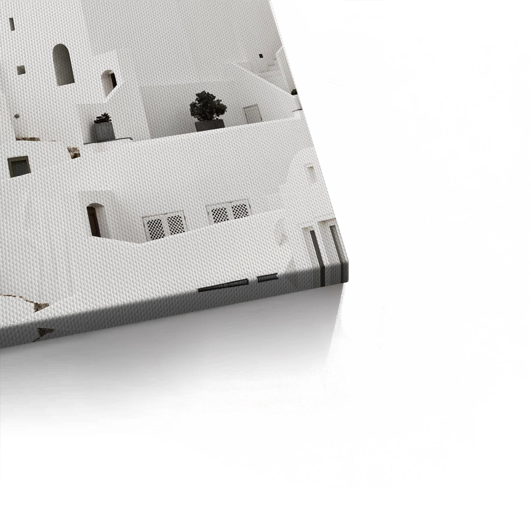 Transport your space to the serene Greek Isles with the Whitewashed art print. This minimalist architectural piece captures the iconic white-washed houses of Santorini, featuring their soft curves, hidden stairways, and geometric simplicity against a pale blue sky. The bright, airy composition creates a sense of infinite peace and Mediterranean luxury. Finished with our signature premium vertical texture, this print offers a sophisticated tactile finish that enhances its clean, high-key aesthetic. It is a perfect addition to a modern bedroom, a tranquil lounge, or a spa-like interior in Dubai.