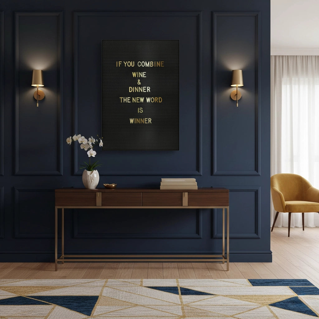 The witty Winner Wine & Dinner - Gold Humorous Typography print is a perfect blend of sophistication and fun, making it ideal for the gourmet or wine enthusiast. The playful quote "IF YOU COMBINE WINE & DINNER THE NEW WORD IS WINNER" is presented in bold, metallic gold sans-serif typography. The dazzling gold text is set against a deep black, textured pinstripe canvas, creating a high-contrast and opulent finish. This piece is designed to be a conversation starter and is the perfect stylish addition to a dining area, kitchen, or modern bar space in Dubai.