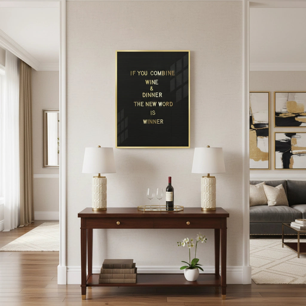 The witty Winner Wine & Dinner - Gold Humorous Typography print is a perfect blend of sophistication and fun, making it ideal for the gourmet or wine enthusiast. The playful quote "IF YOU COMBINE WINE & DINNER THE NEW WORD IS WINNER" is presented in bold, metallic gold sans-serif typography. The dazzling gold text is set against a deep black, textured pinstripe canvas, creating a high-contrast and opulent finish. This piece is designed to be a conversation starter and is the perfect stylish addition to a dining area, kitchen, or modern bar space in Dubai.