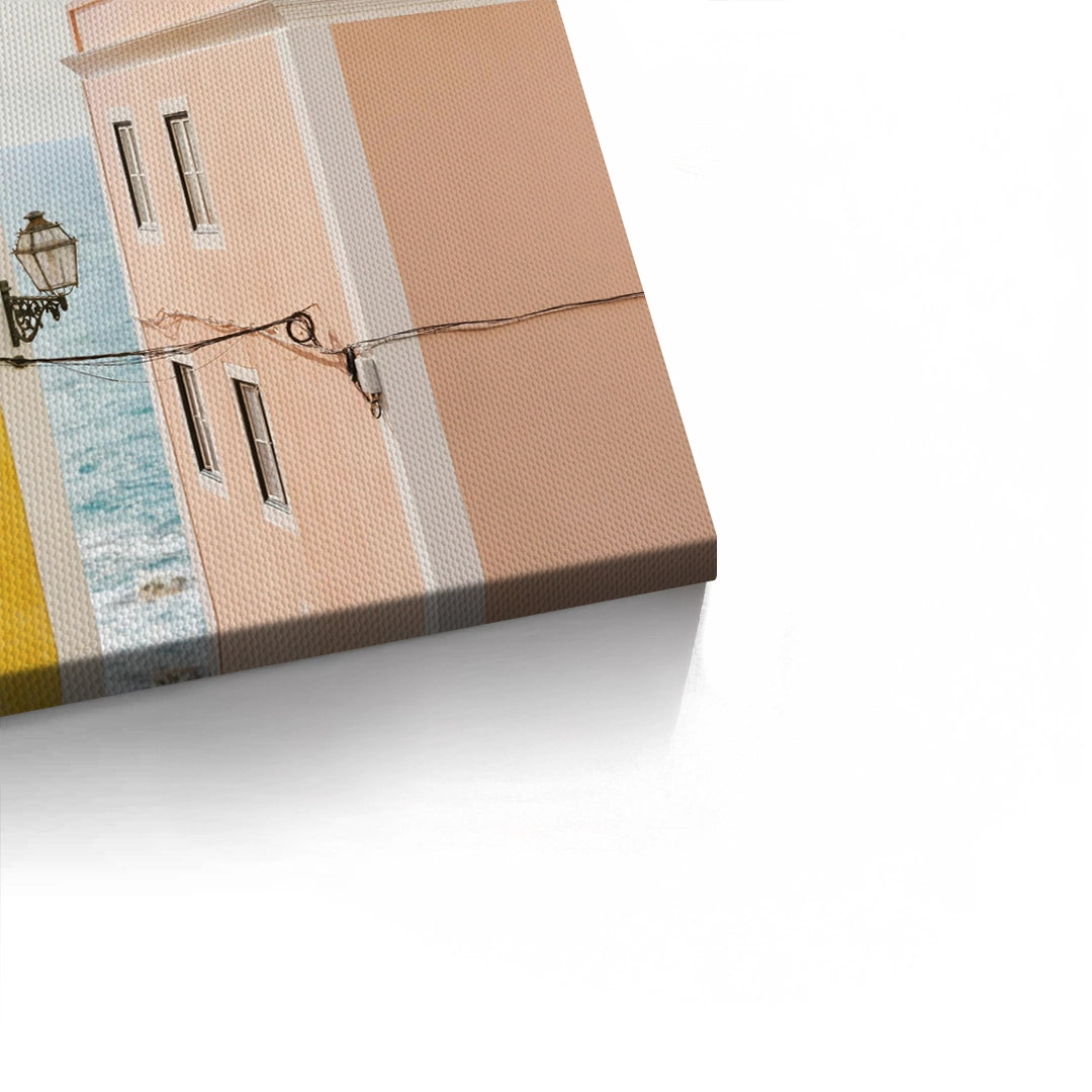 Bring the sunny spirit of Portugal to your walls with the Yellow and Pink Portuguese art print. This cheerful architectural piece captures the iconic contrast of a vibrant yellow building alongside a soft pink facade, typical of Lisbon's charming coastal streets. With details like ornate iron balconies, white-framed windows, and a glimpse of the blue sea beyond a vintage street lamp, this artwork radiates warmth and energy. Finished with our signature premium vertical texture, it offers a high-end, tactile finish. A perfect choice to brighten up a modern kitchen, a lively living room, or a sun-filled balcony space in Dubai.