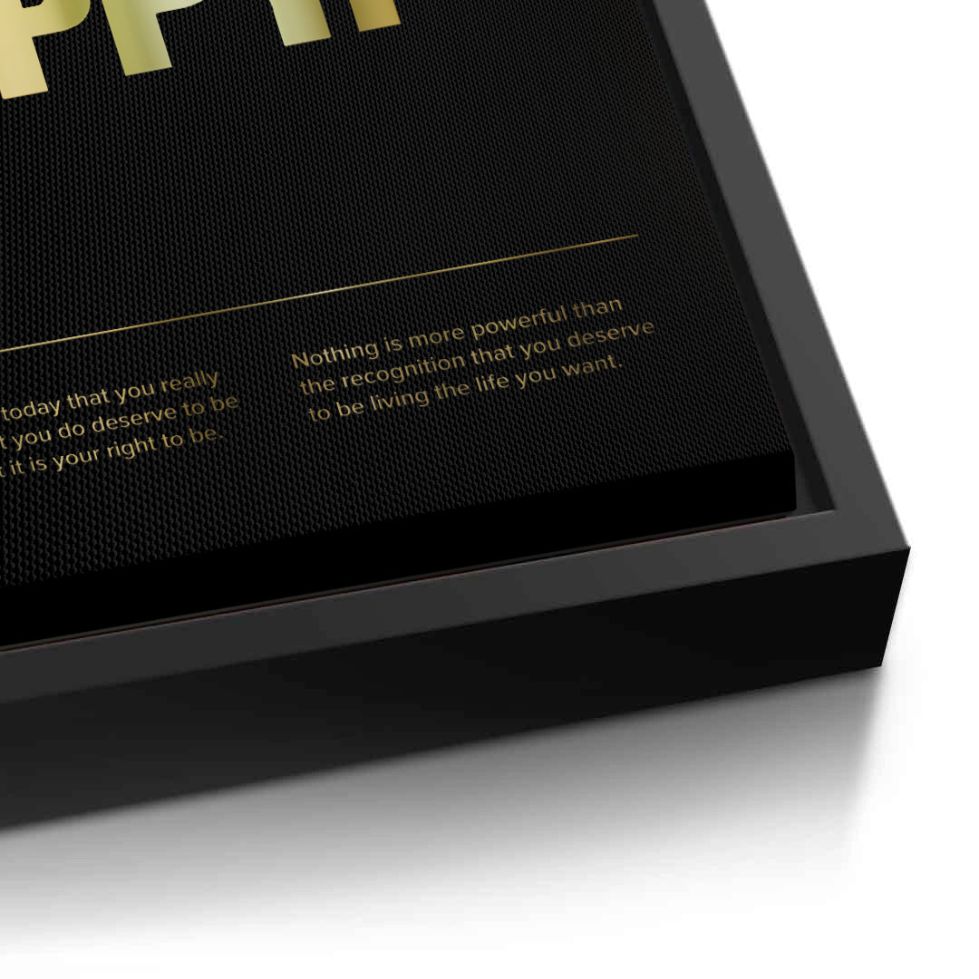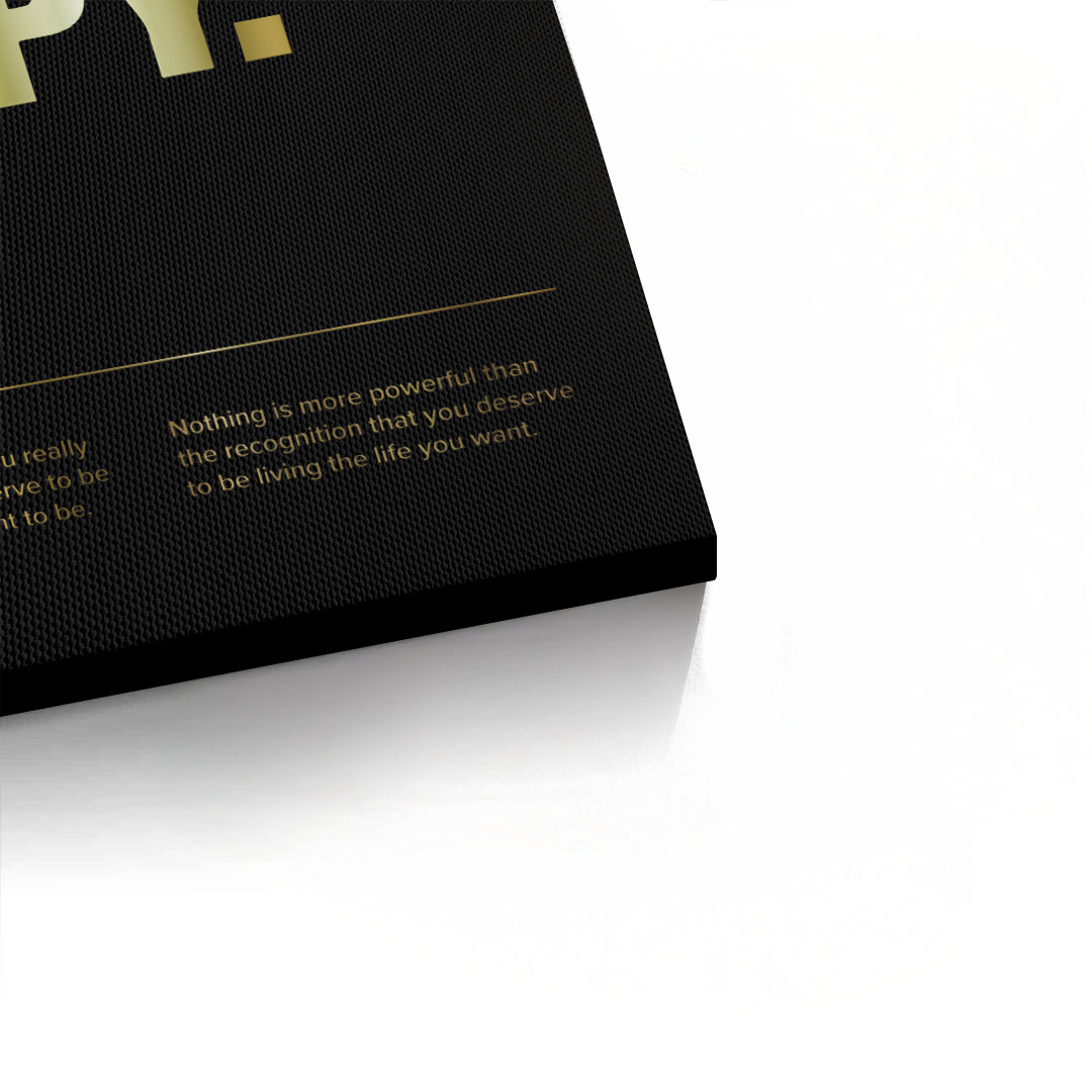 The powerful You Deserve To Be Happy - Gold Self-Affirmation print is a striking piece of motivational luxury. The core message "YOU DESERVE TO BE HAPPY." is presented in large, bold metallic gold sans-serif typography that commands attention. Subtle, supportive affirmations are included below in finer gold script, reinforcing the theme of self-worth. This high-impact gold statement is set against a deep black canvas with a fine ribbed texture, offering a sleek, high-contrast, and ultra-modern aesthetic. Ideal for a motivational focal point in a modern office, bedroom, or sophisticated living area in Dubai.