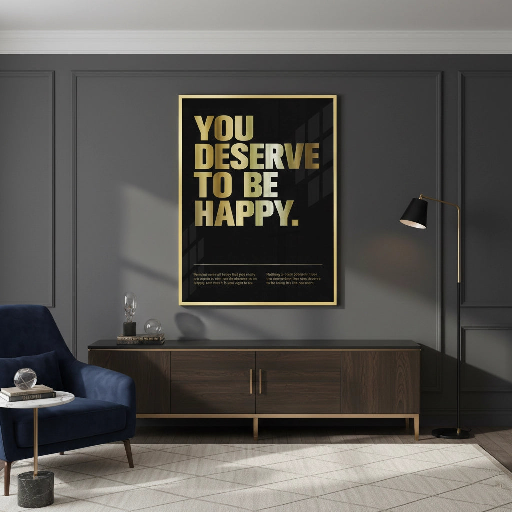 The powerful You Deserve To Be Happy - Gold Self-Affirmation print is a striking piece of motivational luxury. The core message "YOU DESERVE TO BE HAPPY." is presented in large, bold metallic gold sans-serif typography that commands attention. Subtle, supportive affirmations are included below in finer gold script, reinforcing the theme of self-worth. This high-impact gold statement is set against a deep black canvas with a fine ribbed texture, offering a sleek, high-contrast, and ultra-modern aesthetic. Ideal for a motivational focal point in a modern office, bedroom, or sophisticated living area in Dubai.