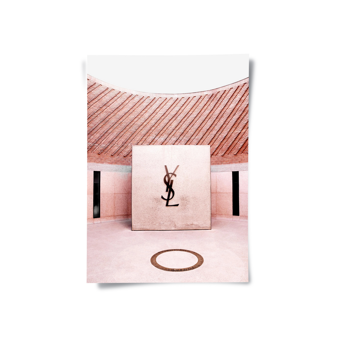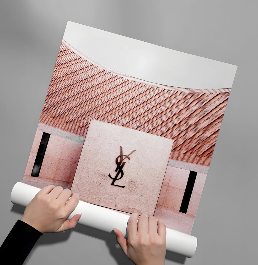 Celebrate the intersection of haute couture and desert design with the YSL Marrakech Courtyard art print. This sophisticated piece captures the iconic circular brickwork and the bold YSL monogram at the heart of Marrakech’s most stylish museum. The warm, sun-kissed palette of dusty rose and terracotta reflects the soul of Morocco, while the clean geometric lines offer a modern, high-fashion aesthetic. Finished with our signature premium vertical texture, this print provides a luxurious tactile depth. It is an exquisite statement piece for a chic dressing room, a high-end fashion boutique, or a stylish modern home in Dubai.