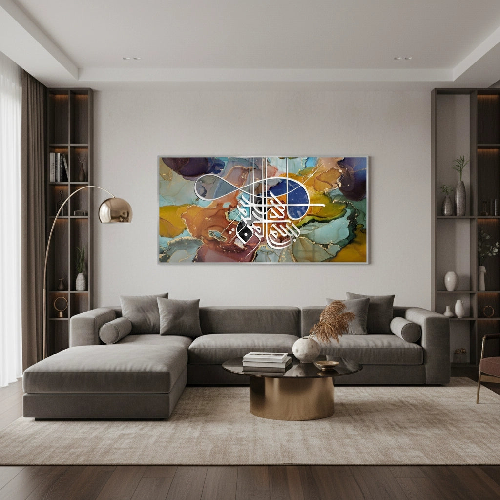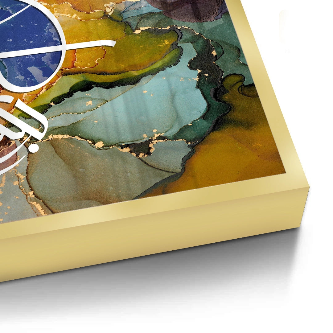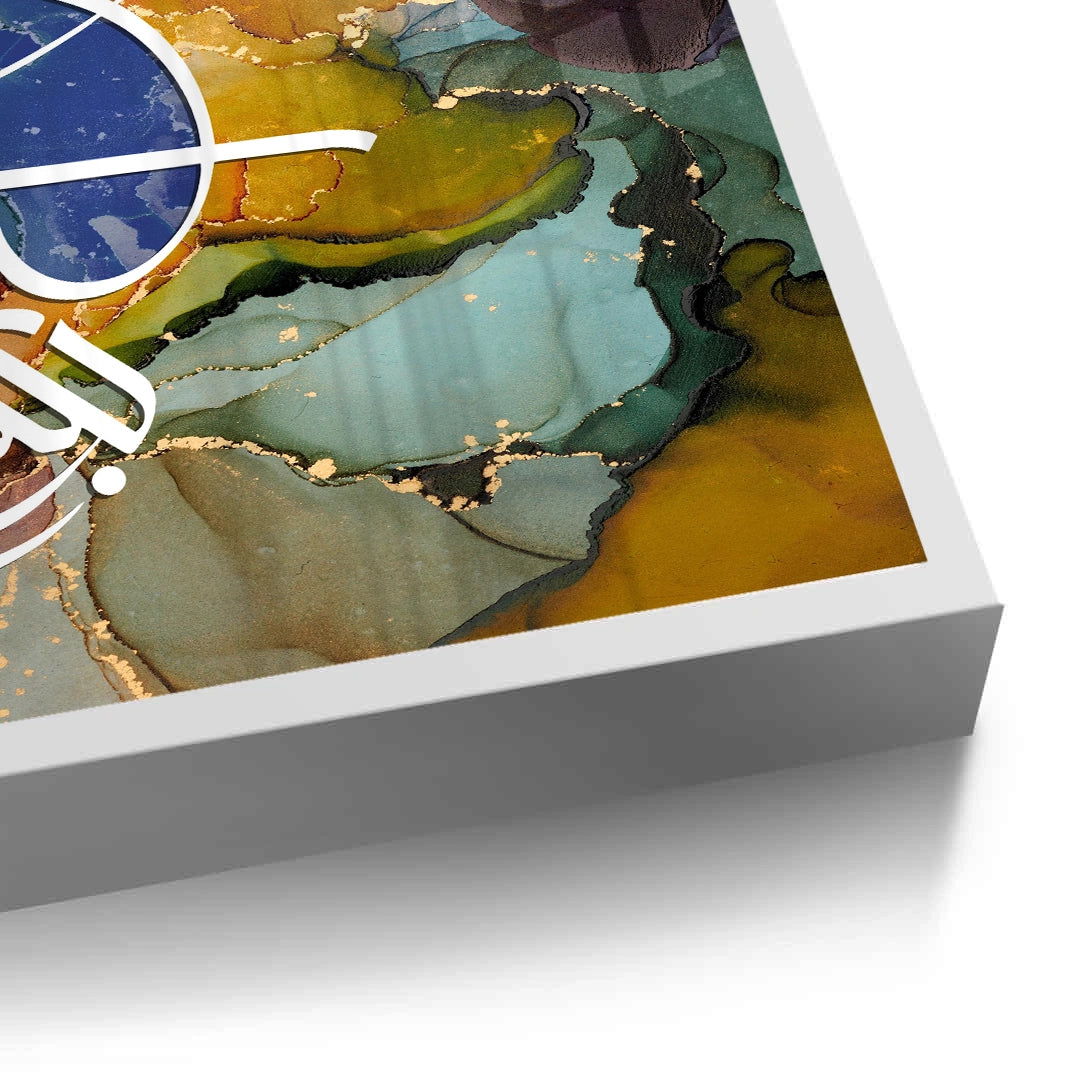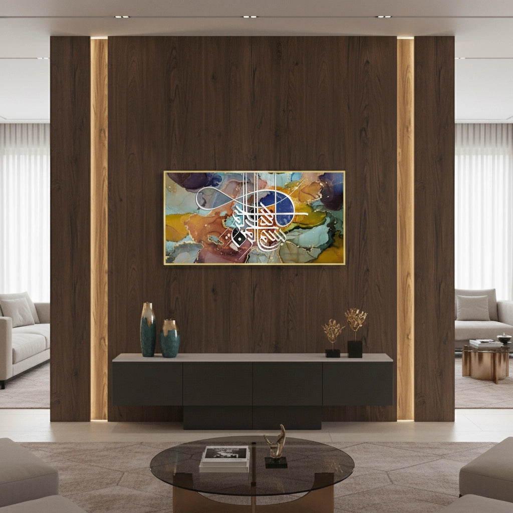 The meditative Zen Brush Calligraphy - Sepia & Gold print is a luxurious piece that balances traditional script with modern textural design. The artwork is dramatically split: the upper section features layered, abstract Arabic script, while the lower section grounds the piece with a smooth, deep brown leather-like texture. An elegant, prominent phrase is rendered in bold metallic gold foil calligraphy on the lower half, creating a focal point of profound spiritual clarity. Ideal for adding a serene, rich, and sophisticated cultural accent to a study or living area in Dubai.