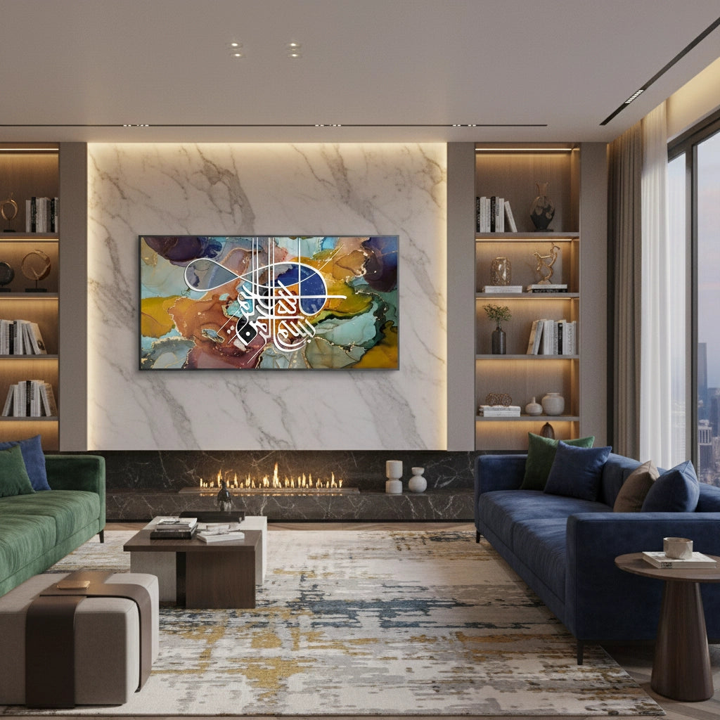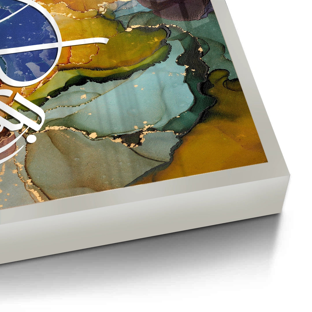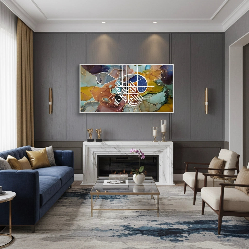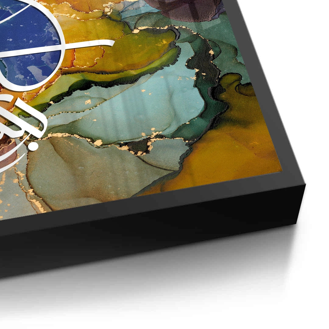 The meditative Zen Brush Calligraphy - Sepia & Gold print is a luxurious piece that balances traditional script with modern textural design. The artwork is dramatically split: the upper section features layered, abstract Arabic script, while the lower section grounds the piece with a smooth, deep brown leather-like texture. An elegant, prominent phrase is rendered in bold metallic gold foil calligraphy on the lower half, creating a focal point of profound spiritual clarity. Ideal for adding a serene, rich, and sophisticated cultural accent to a study or living area in Dubai.