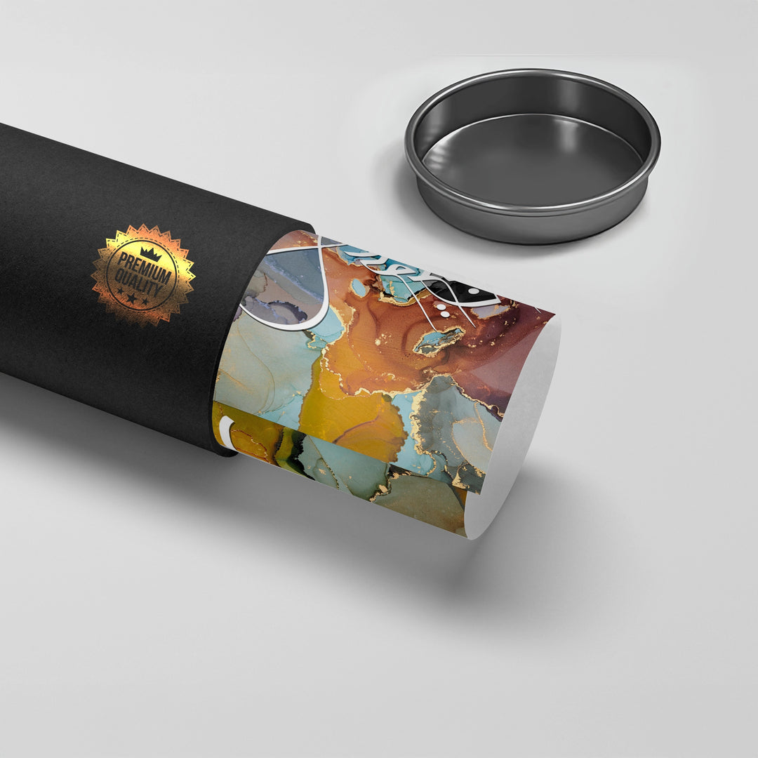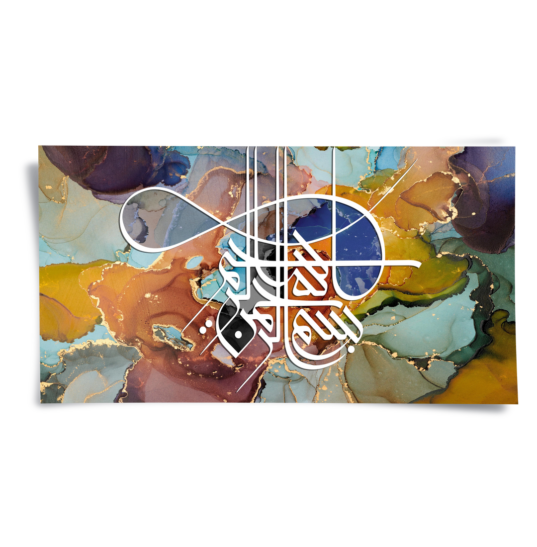 The meditative Zen Brush Calligraphy - Sepia & Gold print is a luxurious piece that balances traditional script with modern textural design. The artwork is dramatically split: the upper section features layered, abstract Arabic script, while the lower section grounds the piece with a smooth, deep brown leather-like texture. An elegant, prominent phrase is rendered in bold metallic gold foil calligraphy on the lower half, creating a focal point of profound spiritual clarity. Ideal for adding a serene, rich, and sophisticated cultural accent to a study or living area in Dubai.